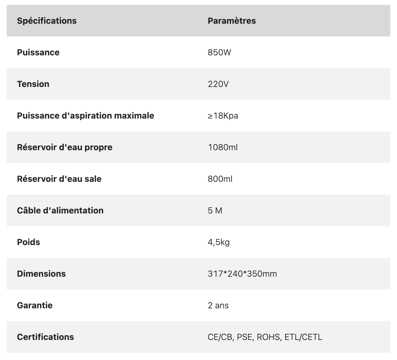 Sa forte puissance d’aspiration garantit un nettoyage en profondeur, améliorant ainsi l’efficacité globale et rendant le processus de nettoyage plus complet et efficace. Elle élimine facilement les taches tenaces, laissant un environnement propre et frais.